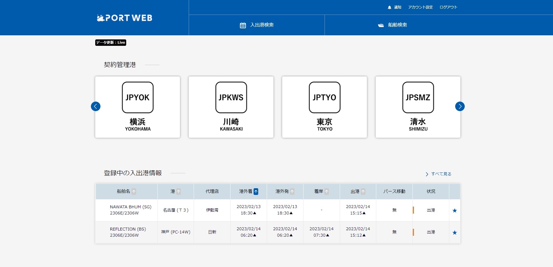 港湾サービス業務や海上輸送業務に広くご利用いただける最新の本船動静情報を素早く検索